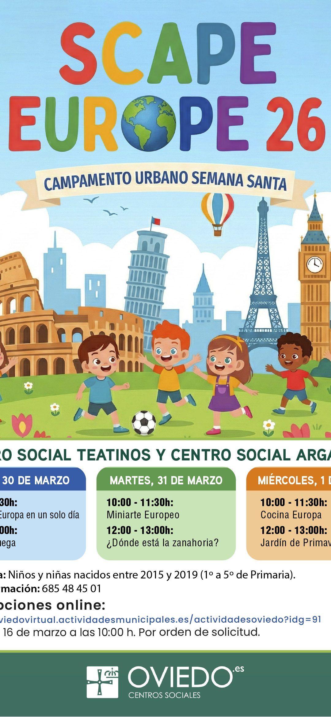 Ya está aquí «Scape Europe 26», un campamento urbano gratuito diseñado para que los más pequeños descubran el continente a través del juego, el arte y la cocina en los centros de Teatinos y Argañosa.